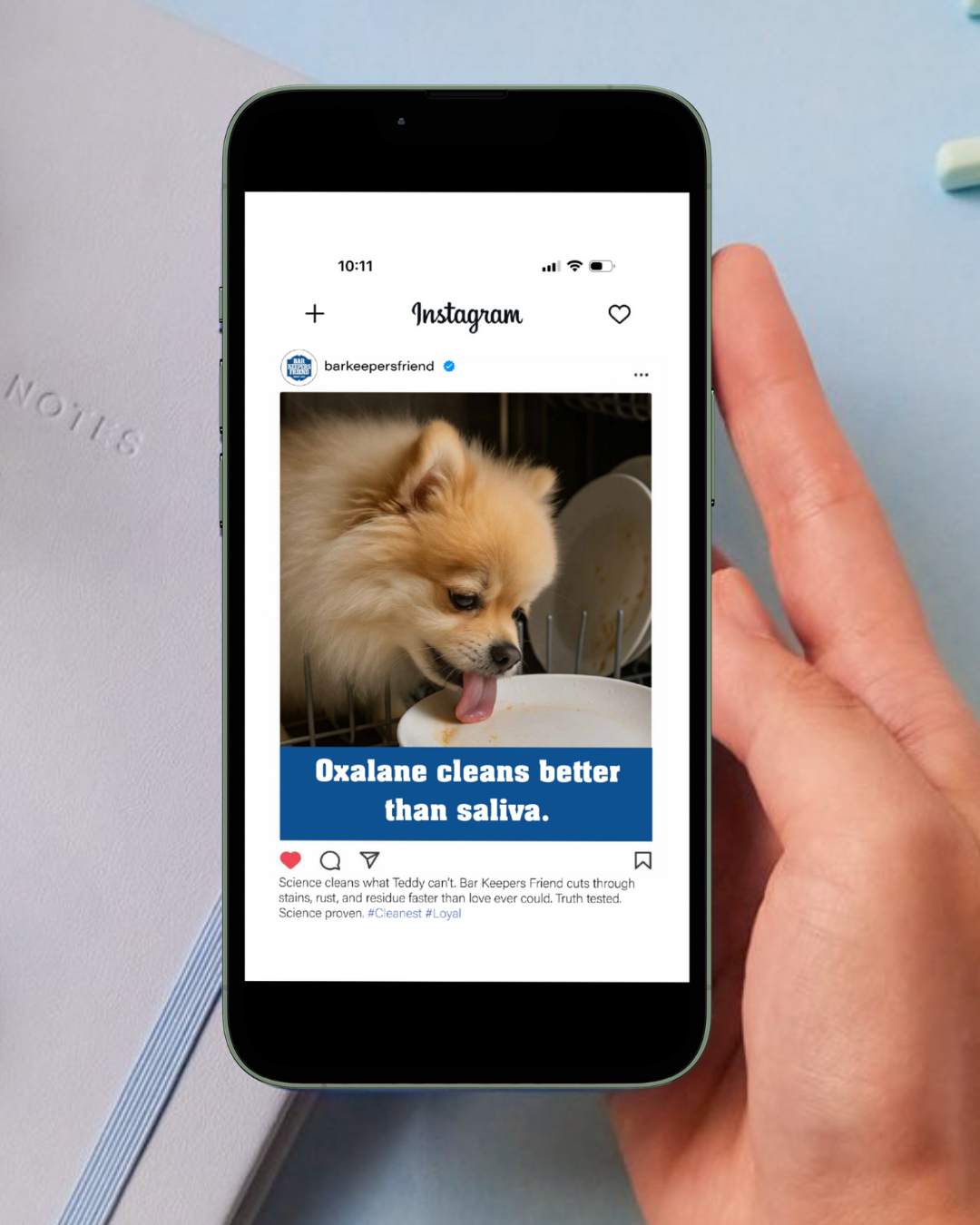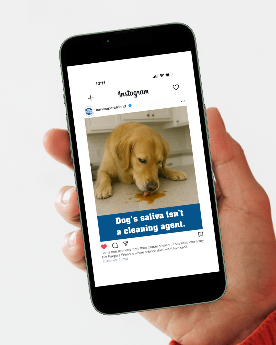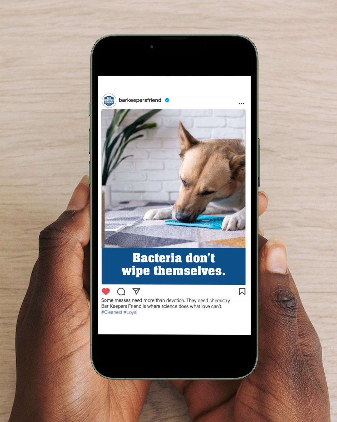 Most college students suck at cleaning and have unusual ways to deal with it; Bar Keepers Friend wants to change that. By pairing loyal and heartwarming dogs with everyday kitchen messes, the ads highlight the brand’s cleaning power in a playful and memorable way. Everyone can relate to dogs licking up their messes; however, it’s time for our customers to face the fact that Bar Keepers Friend is what they need to keep their kitchens and everything in them clean.